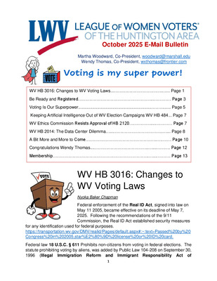 League of Women Voters of the Huntington Area E-mail Bulletin, October 2022